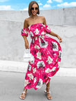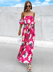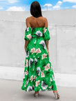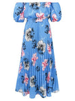 Robe midi plissée à fleurs et épaules dénudées, manches courtes