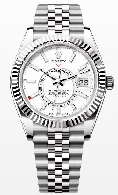 The Oyster Perpetual Sky-Dweller 42mm in Oystersteel and white gold with an intense white dial and a Jubilee bracelet.
