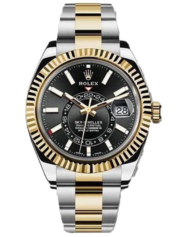42mm yellow Rolesor case comprised of a 904L steel monobloc middle case, screw-down back, screw-down crown, 18K yellow gold fluted bezel with bidirectional rotatable Rolex Ring Command, scratch-resistant sapphire crystal with cyclops lens over the date and double anti-reflective coating, black dial, index hour markers, Rolex calibre 9001 automatic movement , second time-zone displayed via off-center rotating disc, Saros annual calendar with date at 3 o'clock and month indicated in discrete apertures at each of the 12 hour marks, stainless steel and 18K yellow gold Oyster bracelet, folding Oysterclasp buckle with Easylink 5mm comfort extension link. Waterproof to 100 meters.