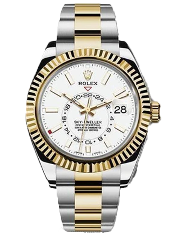42mm yellow Rolesor case comprised of a 904L steel monobloc middle case, screw-down back, screw-down crown, 18K yellow gold fluted bezel with bidirectional rotatable Rolex Ring Command, scratch-resistant sapphire crystal with cyclops lens over the date and double anti-reflective coating, white dial, index hour markers, Rolex calibre 9001 automatic movement , second time-zone displayed via off-center rotating disc, Saros annual calendar with date at 3 o'clock and month indicated in discrete apertures at each of the 12 hour marks, stainless steel and 18K yellow gold Oyster bracelet, folding Oysterclasp buckle with Easylink 5mm comfort extension link. Waterproof to 100 meters.