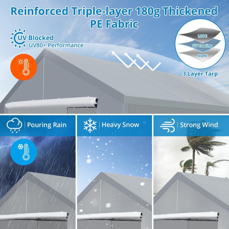 - 【Waterproof Top Cover】Our car tops feature a waterproof top cover made of heat-sealed, three-layer 180 gram polyethylene fabric. This high quality material is not only UV resistant, but also tear resistant, providing your vehicle or boat with reliable protection from the four seasons of rain and wind. From wind and sun to rain, dust, hail and snow, this canopy cover ensures that your belongings are protected. Trust its durability and performance to keep your valuable possessions safe.