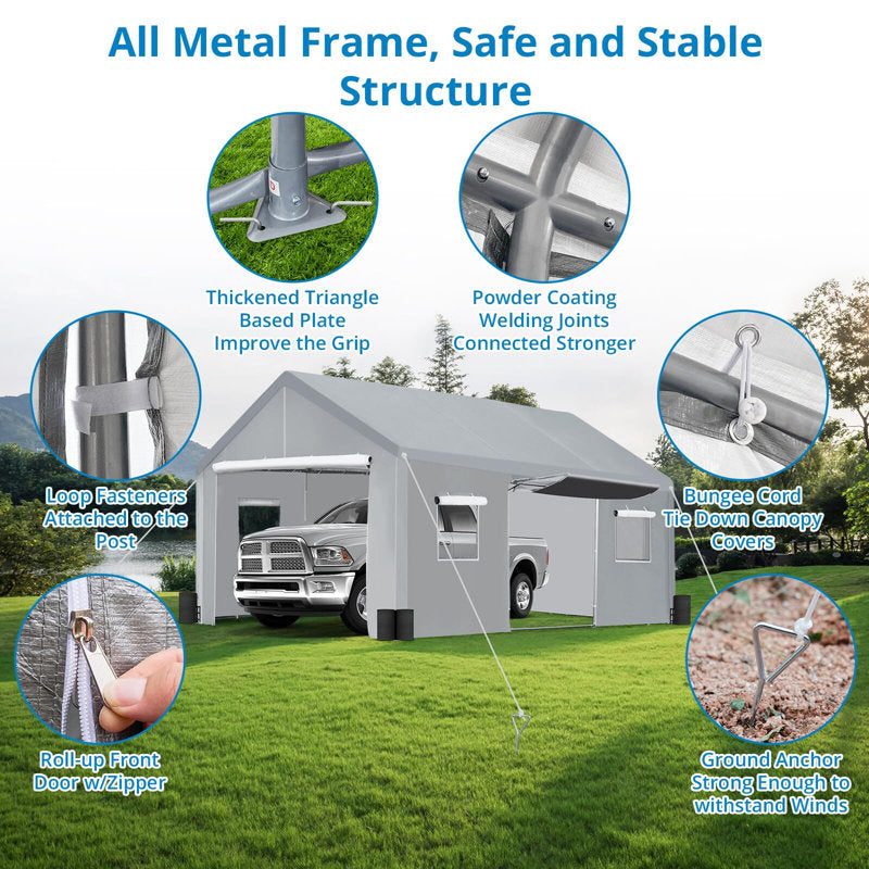 - 【Ventilated Windows and Zipper Doors】Our carports are better ventilated compared to other carports when they have 4 mesh windows and roll-up doors with zippers. This aids in air circulation and prevents moisture buildup, ensuring that your vehicle stays dry and well-protected.