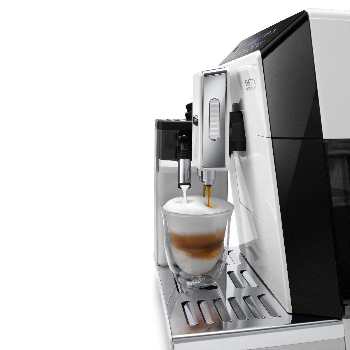 The DeLonghi ECAM44660W White Eleltta Superautomatic Coffee and Espresso machine brings a variety of barista quality drinks at the touch of a button. The Eletta’s outstanding convenience makes morning and nighttime drinks a pleasure, especially for those who prefer both convenience and quality.