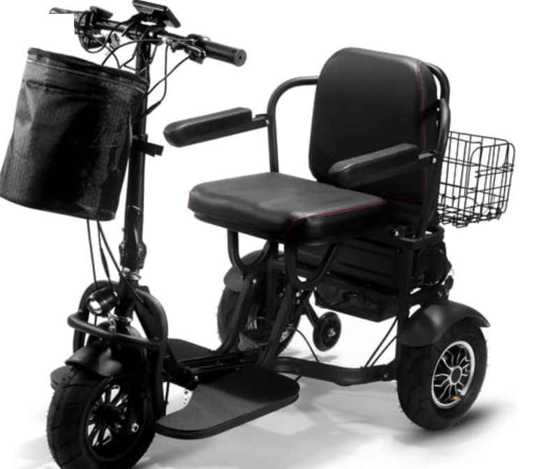 Introducing the new 1000 watt Folding Mobility Scooter by MotoTec. Its compact, three wheel styling makes for a sharp turning radius, 2 hub motors built into the rear wheels provide amazing torque for riding up inclines with its light weight durable frame made from Aluminum. The lithium battery is light weight and lasts longer than your standard competing lead acid models. Comes standard with headlight, rear light, key start, 3 forward speeds(with additional slow 2mph store speed), reverse, dual rear disk brakes, comfortable seat with arm rests and backrest, front & rear baskets and large 11 inch air filled tires to provide a comfortable ride.