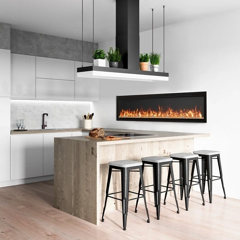 Control is paramount with the Entice 60″. The included remote puts you in command of every aspect of the fireplace. Adjust flame intensity, colors, and ember bed hues while enjoying the peace of mind that no gas fitter is required for installation—simply hang on your chosen wall, plug in, and be captivated. Designed with a shallow profile, it claims minimal space, providing warmth and charm without dominating your living area. For those with a penchant for seamless integration, it offers options to be fully or partially recessed. This aesthetic marvel, bordered with a nearly invisible frame, ensures the focus remains on the vibrant display of the fireplace itself, making the Napoleon Entice 60″ Wall-Hanging Linear Electric Fireplace a luxurious addition to any modern home.