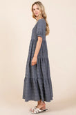 The Textured Short Sleeve Tiered Dress is a stylish and versatile piece for any occasion. Featuring a textured fabric, this dress offers a unique and trendy look. With its tiered design and short sleeves, it combines fashion and comfort effortlessly.