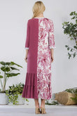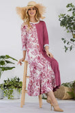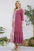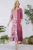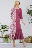 This modest midi-dress is decorated with color contrast, tie dye. This 3/4 ruffle sleeve piece is designed with a round neck, tiered ruffle skirt, and concealed side pockets. This dress is perfect for weekends, school, and summer fall transition.