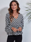 Checkered V-Neck Balloon Sleeve Peplum Blouse