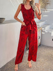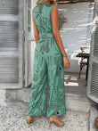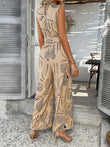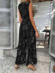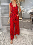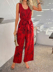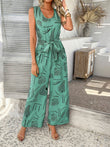 Devine Printed Round Neck Sleeveless Tie Waist Jumpsuit