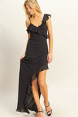 Make a statement in this Chiffon Ruffle Trim Midi Dress. The chiffon fabric lends an airy and elegant look to the dress, perfect for a special occasion or event. The ruffle trim adds a feminine and romantic touch, creating movement and interest. The midi length offers a classy and sophisticated silhouette, suitable for various dress codes. Pair this dress with heels and delicate accessories for a chic and graceful ensemble that is sure to make you stand out.