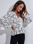 Printed V-Neck Balloon Sleeve Peplum Blouse