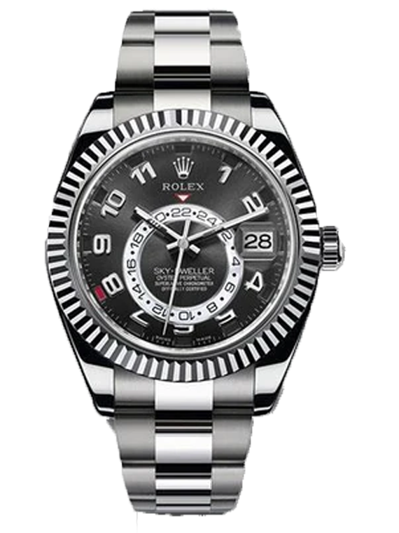 42mm 18K white gold case, screw-down back, screw-down crown, fluted bezel with bidirectional rotatable Rolex Ring Command, scratch-resistant sapphire crystal with cyclops lens over the date and double anti-reflective coating, black dial, Rolex calibre 9001 automatic movement , second time-zone displayed via off-center rotating disc, Saros annual calendar with date at 3 o'clock and month indicated in discrete apertures at each of the 12 hour marks, 18K white gold Oyster bracelet with flat three-piece links, folding Oysterclasp buckle with Easylink 5mm comfort extension link. Waterproof to 100 meters.