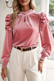 Tie Up Mock Neck Velvet Fabric Long Sleeve Blouse